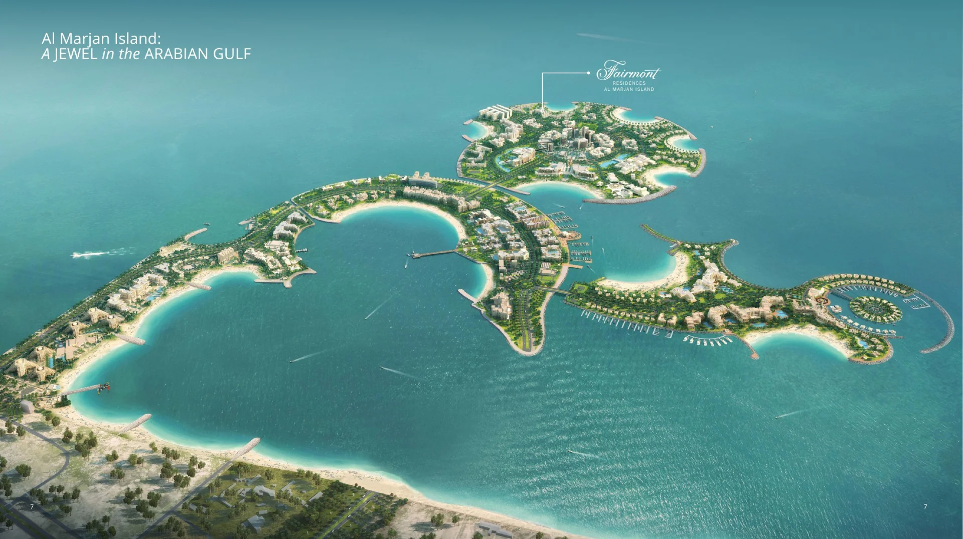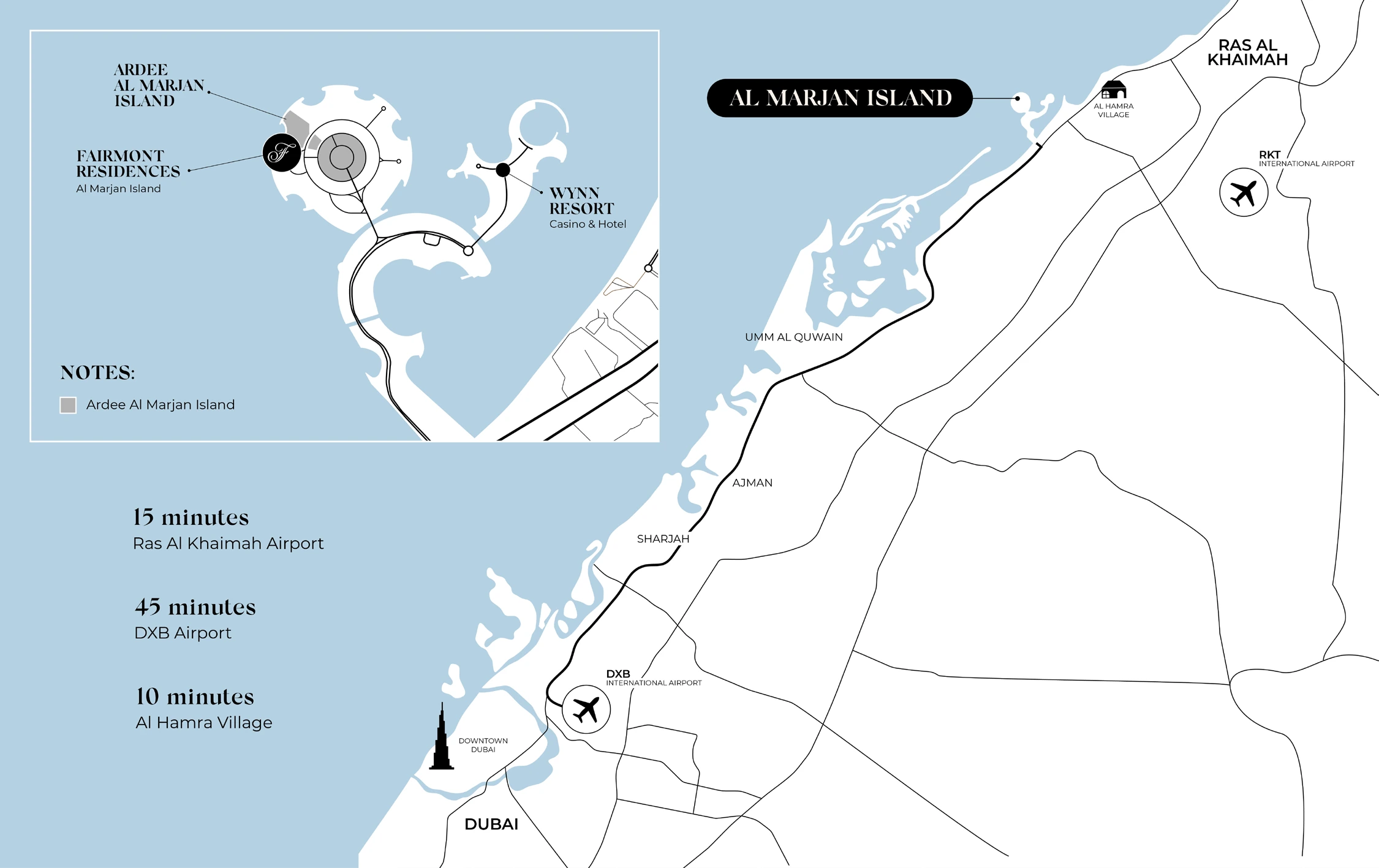 במיקום אסטרטגי, במרחק הליכה משני מרכזים בינלאומיים מרכזיים, מלון פיירמונט רזידנסס אל מרג'אן איילנד נהנה מגישה נוחה לשדה התעופה הבינלאומי ראס אל ח'ימה (RAK) ולשדה התעופה הבינלאומי של דובאי (DXB), והוא מורכב מארבעה איים בצורת אלמוגים. ביניהם נמצא פיירמונט רזידנסס אל מרג'אן איילנד הקרוב, שיספק לתושבים מגורים ללא תחרות על שפת הים. ראוי לציין כי האי צפוי לארח את הקזינו הראשון של איחוד האמירויות הערביות באתר הנופש Wynn Al Marjan Island הקרוב.